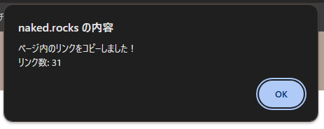 このブックマークレットを使用すると、今開いているページ内に存在する<a href=""></a>で設定されているURL一覧をコピーすることが出来ます。